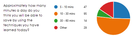 An estimated average time saved per day based on the knowledge gained in the training is 10 -30 minutes.